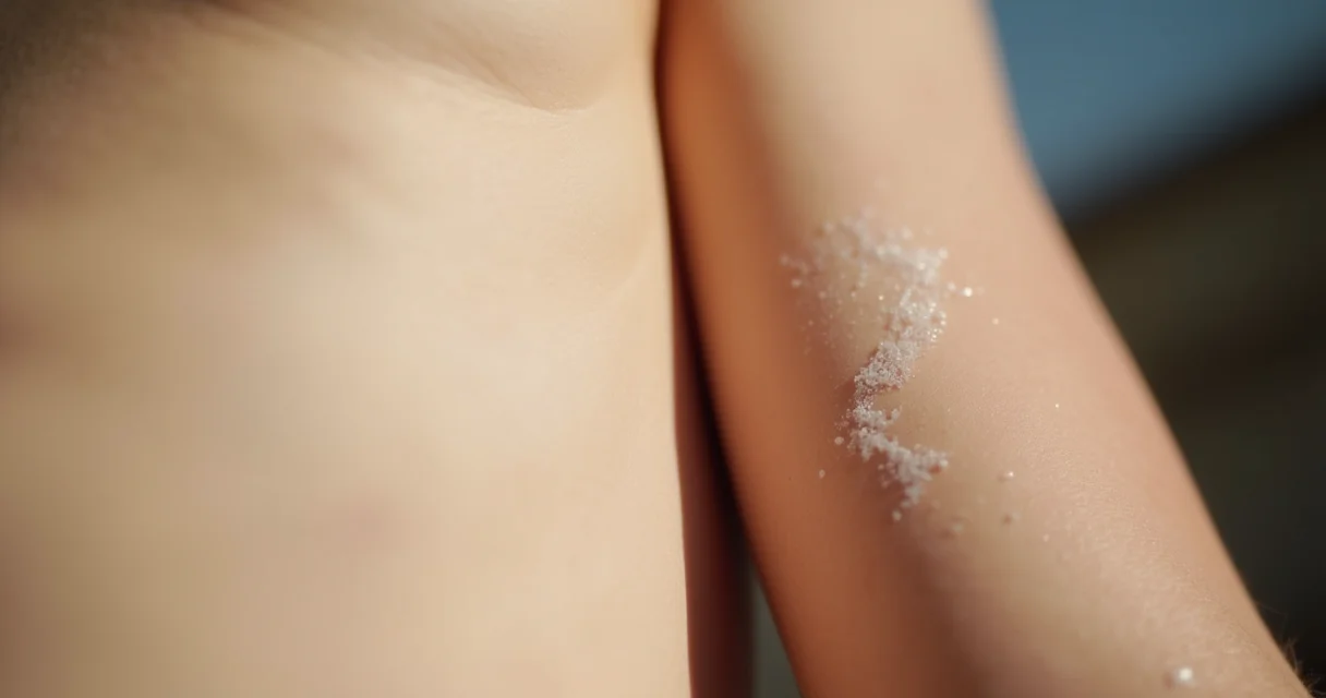 Pele de axila com textura aveludada após esfoliação suave, com partículas esfoliantes ainda visíveis.