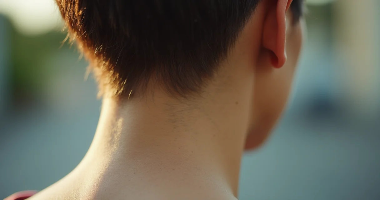 Close-up extremo de uma nuca com cabelo curto e fino, em tom castanho claro, com a pele lisa e iluminação que realça a delicadeza dos fios.