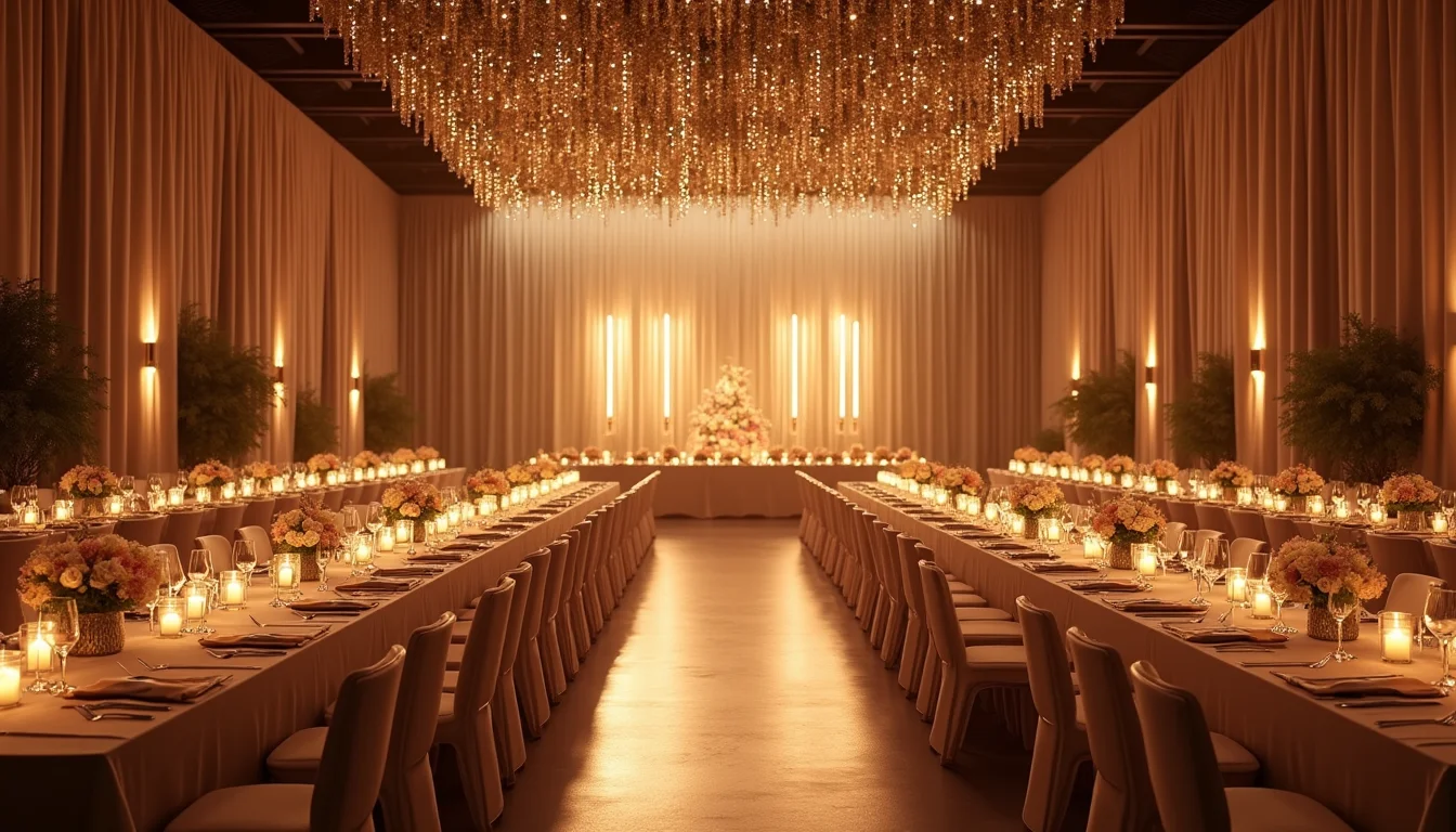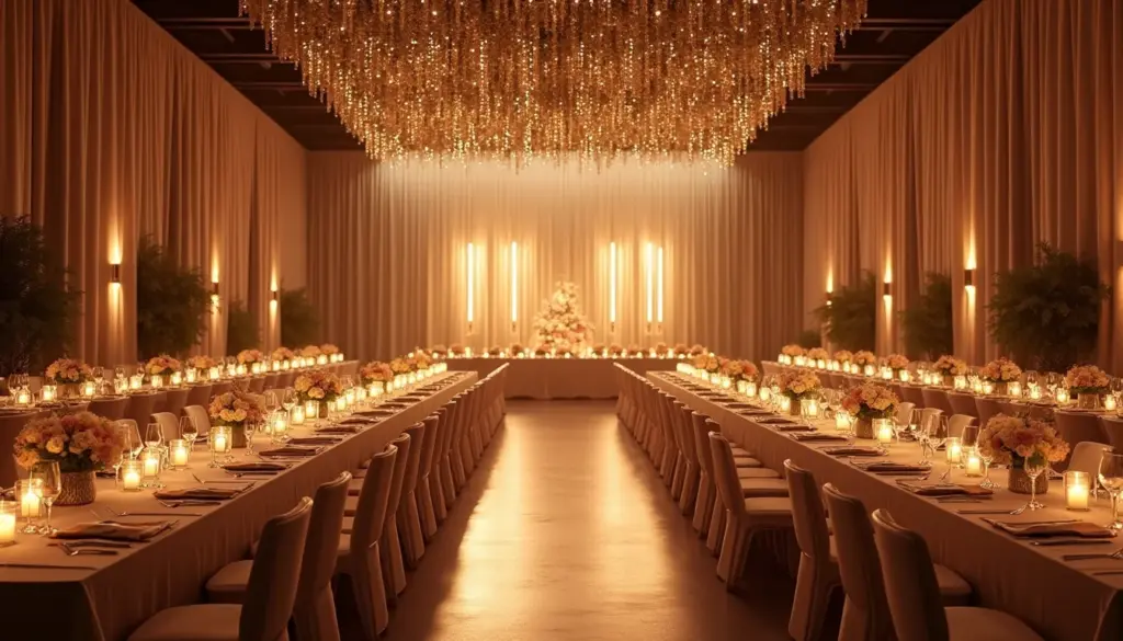 Iluminação cênica com spots direcionados para a mesa principal, projetando feixes de luz branca quente sobre toalhas de mesa em linho bege e centros de mesa baixos.