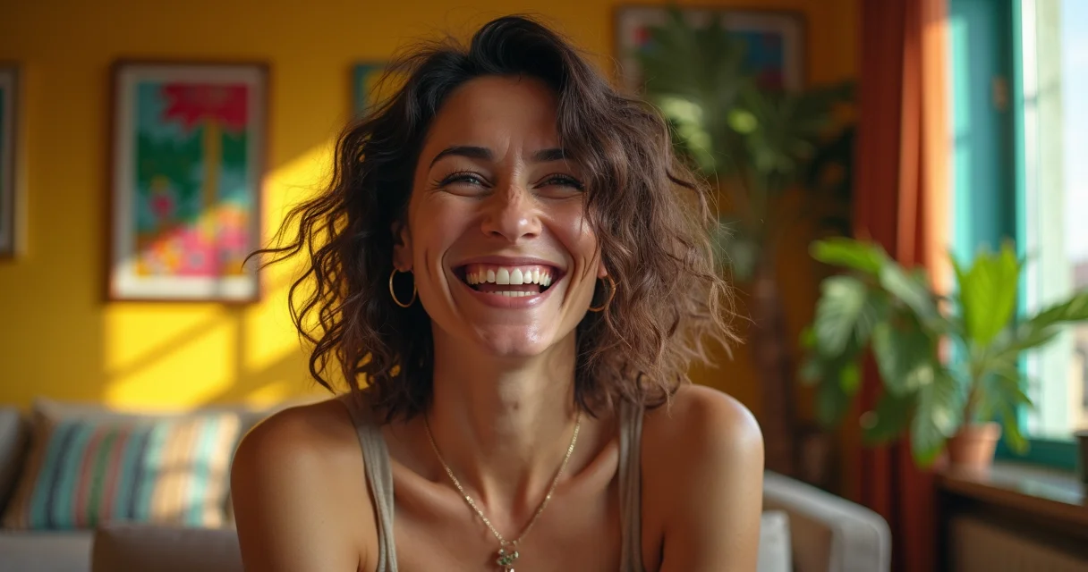 Ondas soltas que emolduram o sorriso.