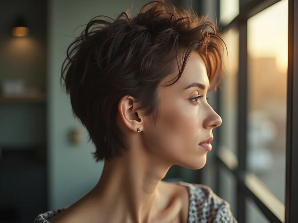 Corte repicado em camadas em cabelo castanho escuro, com fios mais curtos no topo e gradualmente mais longos na base, criando suavidade nos contornos do rosto, sob luzes direcionadas.