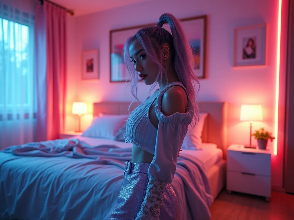 A iluminação é fundamental para capturar a essência de palco do K-pop. Experimente luzes direcionadas para destacar elementos específicos da decoração ou use fitas de LED para criar contornos e dar um toque futurista.