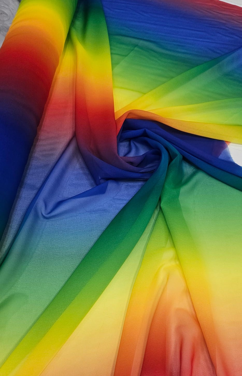 Um degradê arco-íris sutil em uma cortina traz um toque lúdico e alegre, perfeito para espaços infantis ou áreas de lazer.