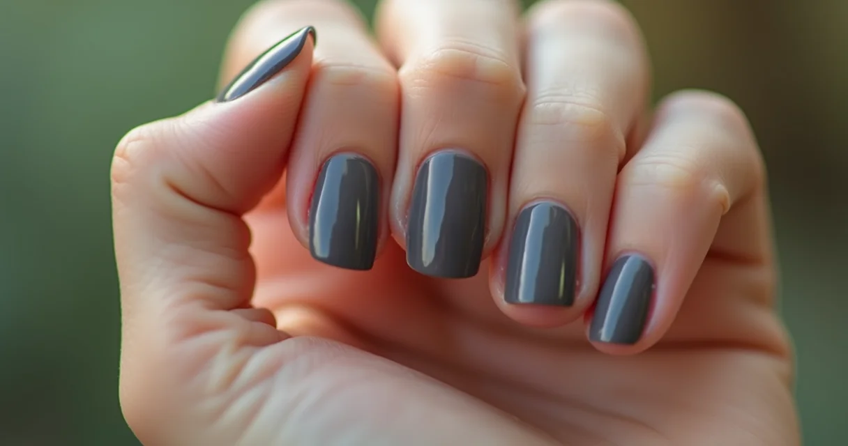 Close-up de unha com esmalte cinza chumbo cremoso, acabamento brilhante, em ambiente com luz natural suave.