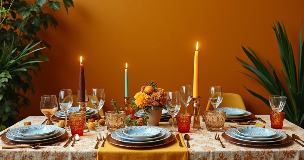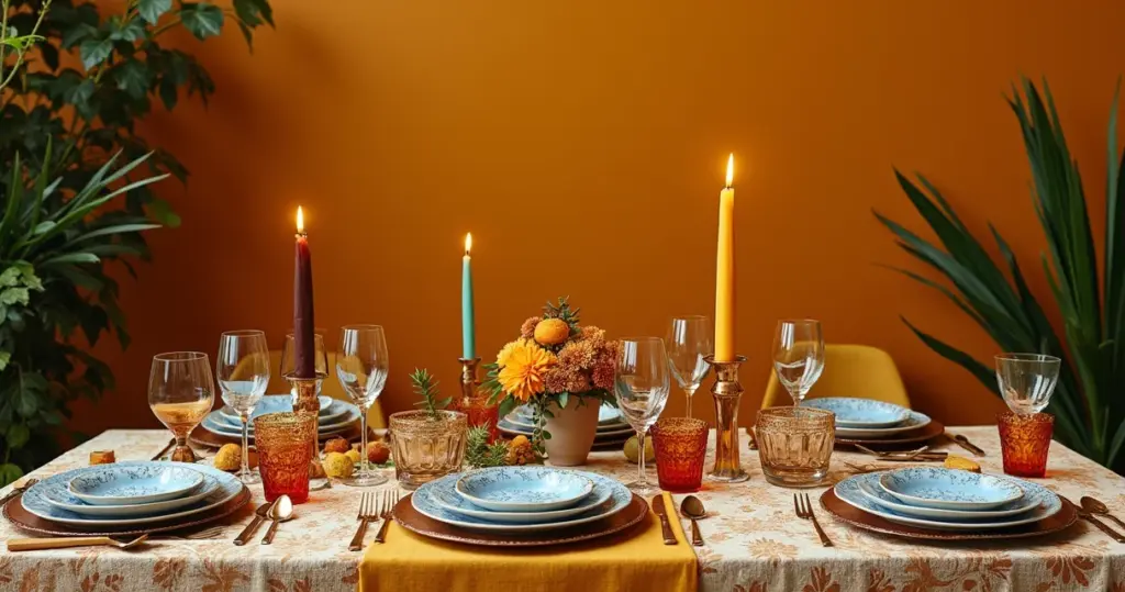 Luzes quentes criando sombras dançantes na mesa de linho.