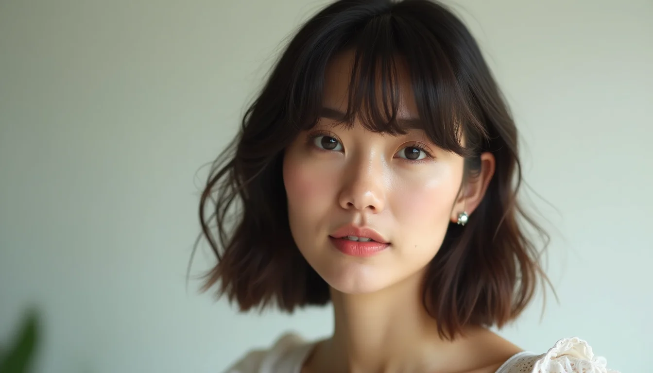 Se você busca leveza e um toque moderno, a Franja Desfiada, também conhecida como Choppy Bangs, é uma excelente pedida. Suas pontas irregulares e a textura mais solta evitam o peso visual que poderia acentuar a largura do rosto redondo. Em vez disso, ela cria um efeito de movimento e desvia a atenção para as características mais delicadas do seu rosto, como os olhos. É uma opção que combina com diversos estilos, do casual ao mais elaborado.