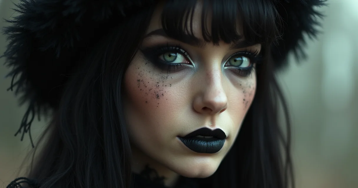 A maquiagem é outro pilar fundamental: olhos marcados com delineador e sombras escuras, lábios em tons de vinho, roxo ou preto, e uma pele pálida que realça o contraste. O cabelo, geralmente escuro e com cortes ousados, complementa essa imagem de beleza intensa e autêntica.