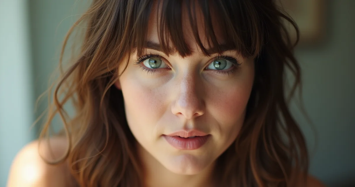 Cabelo médio com franja despojada e curta, cor castanho médio, textura natural, iluminação suave vinda de cima.