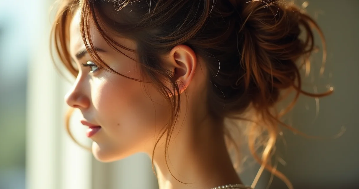 Coque alto com efeito ‘messy’ em cabelo castanho avermelhado, com mechas propositalmente soltas e textura levemente bagunçada, sob luz ambiente suave.